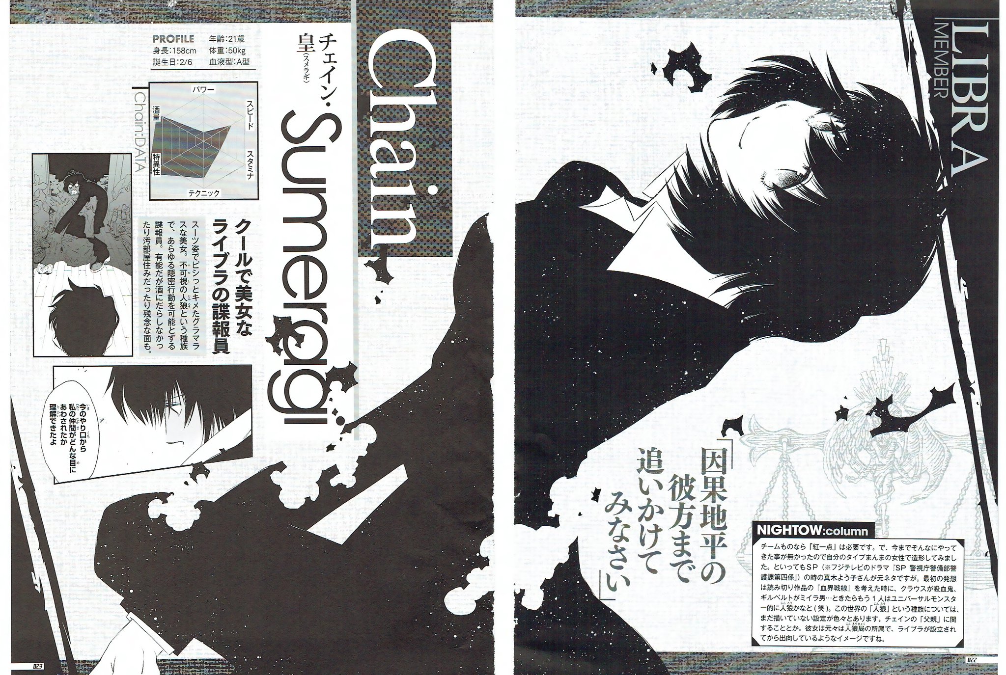 Chain Sumeragi (チェイン・皇・すめらぎ, Chein Sumeragi), is an Invisible Werewolf and a member of the Werewolf Bureau that was assigned to Libra. She does a large amount of Libra's reconnaissance work. Her power is erasing her presence, which needs a link to connect her to the world in order to counter the effect of her ability or she will cease to exist.