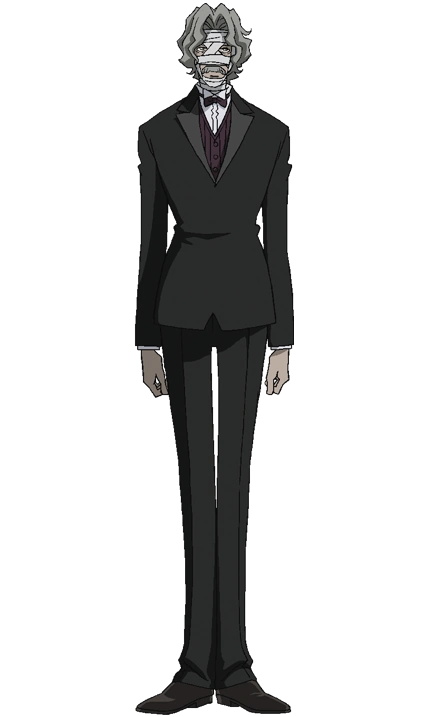 Gilbert is an older gentlemen with grey, wavy hair and pale skin clad in typical butler attire. His most notable feature are the bandages which cover the majority of his face save for his eyes, mouth and hair.